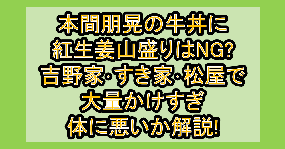 本間朋晃の牛丼に紅生姜山盛りはNG?吉野家・すき家・松屋で大量かけすぎ体に悪いか解説! 公開日:2026年2月19日 知恵袋 プロレスラーの本間朋晃さんが吉野家の牛丼に紅生姜山盛りで炎上したようですが、そもそも牛丼に無料の紅生姜を山盛りかけるのは駄目なのでしょうか? ということで今回は、本間朋晃さんのように牛丼に無料の紅生姜を山盛 […] 続きを読む